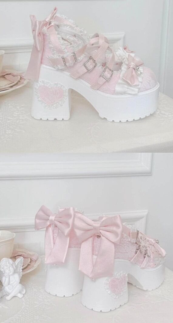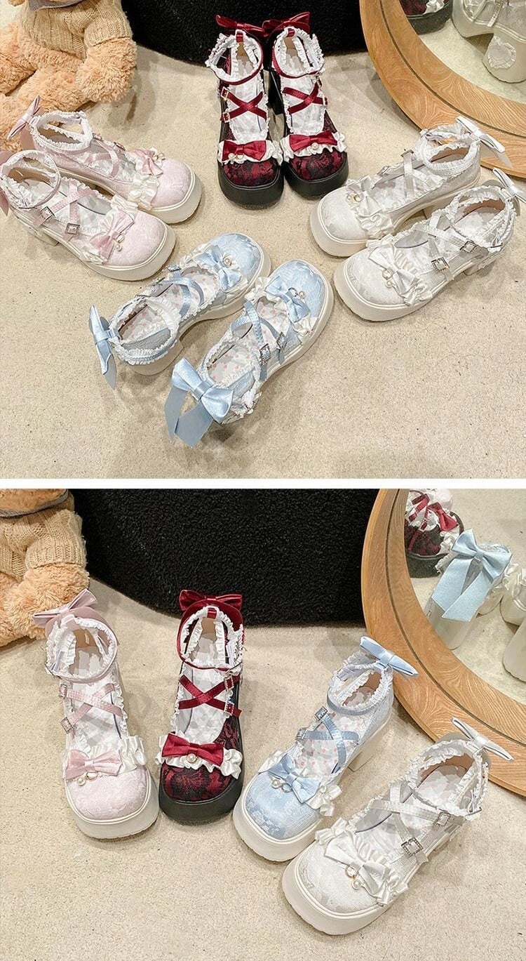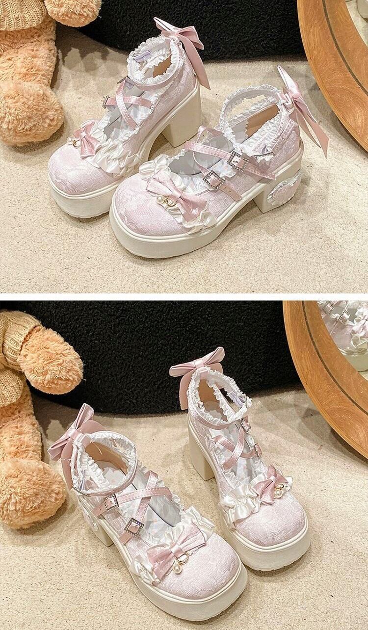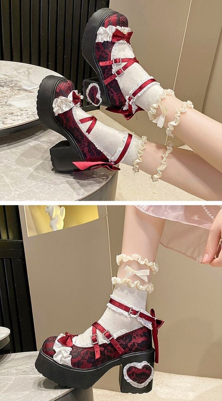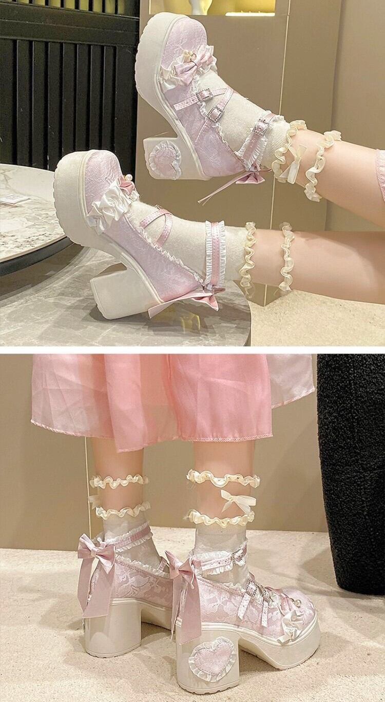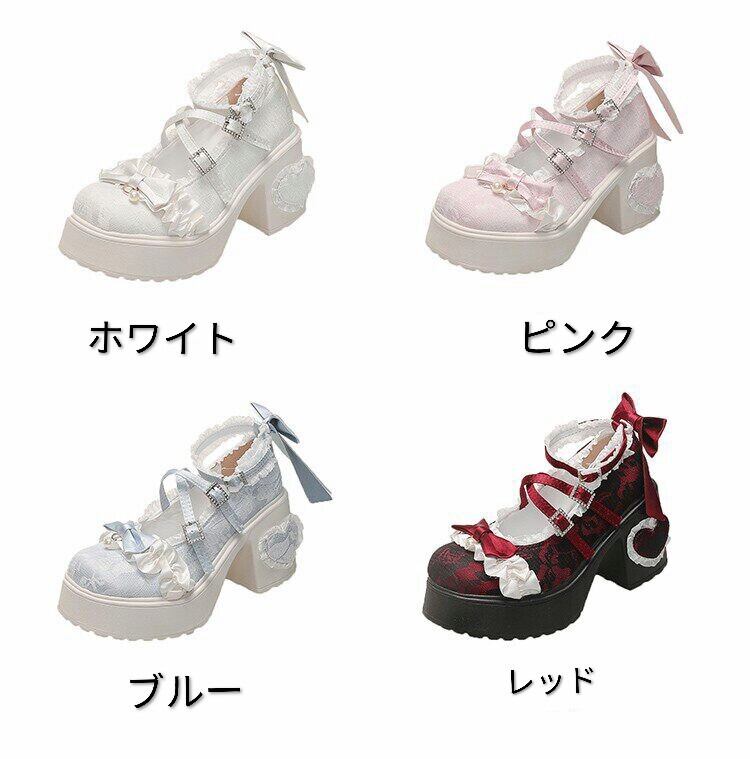 ロリータ 総レース ストラップ パンプス ハイヒール リボン 4color