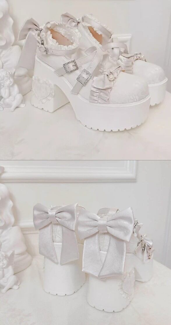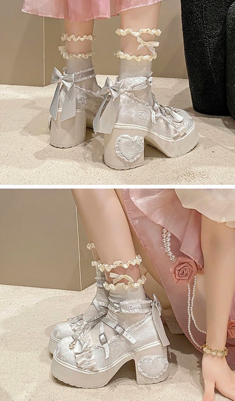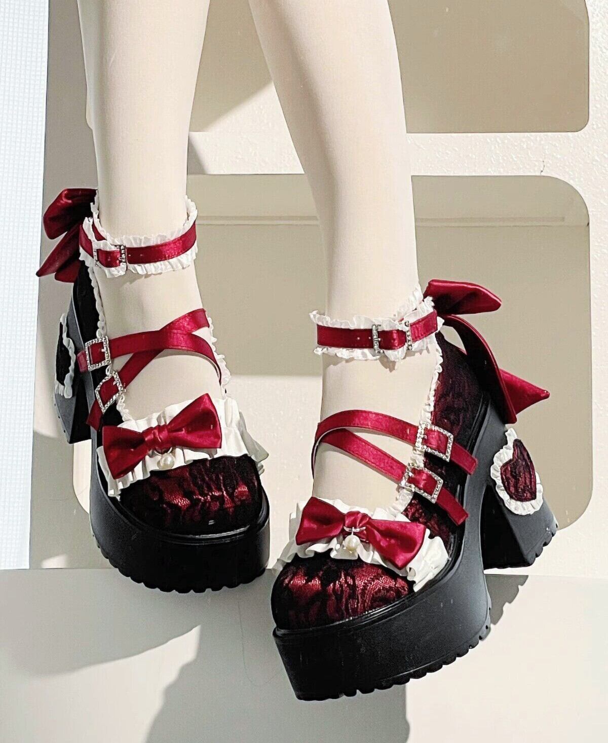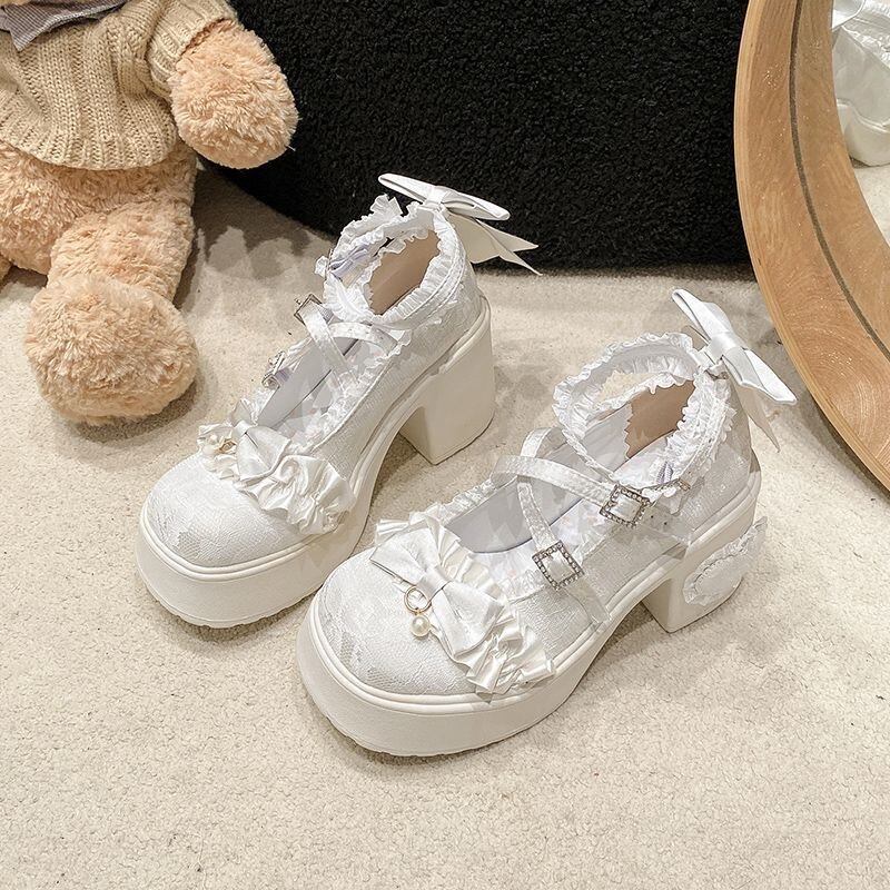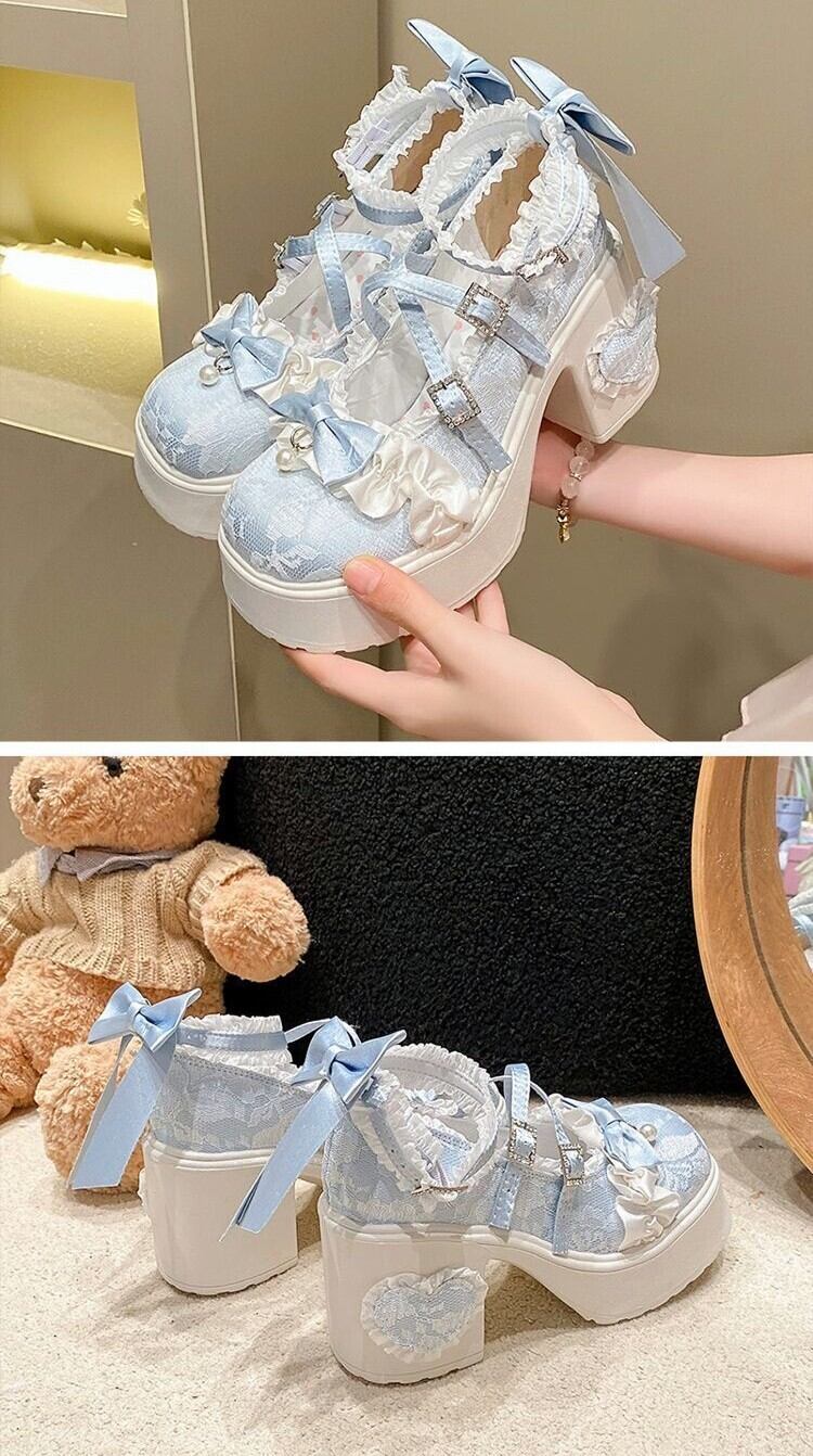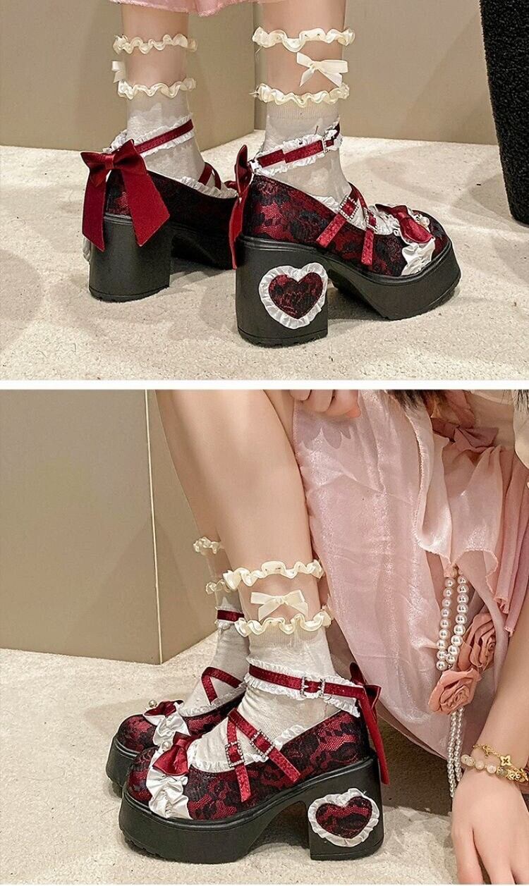 ロリータ 総レース ストラップ パンプス ハイヒール リボン 4color