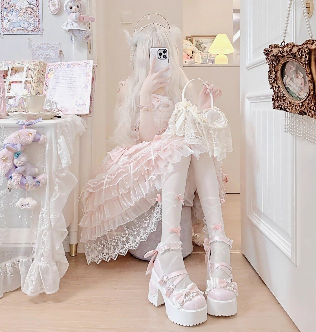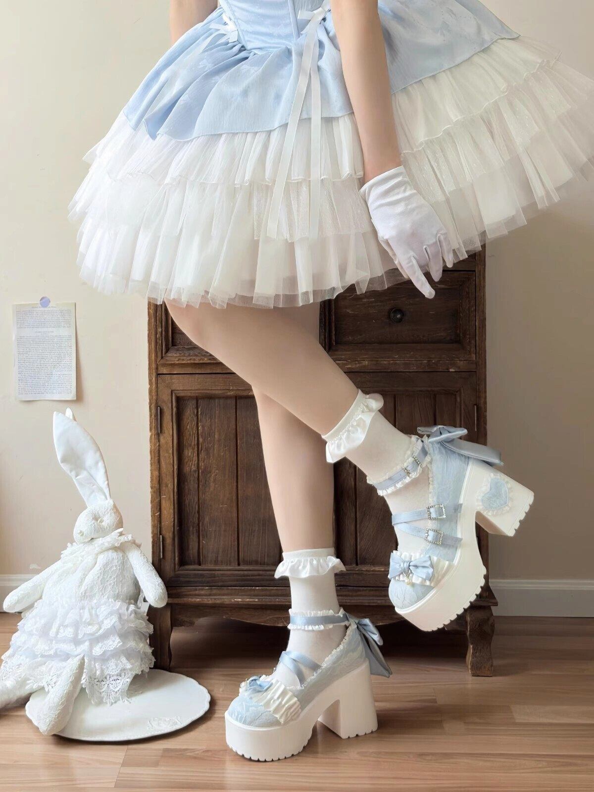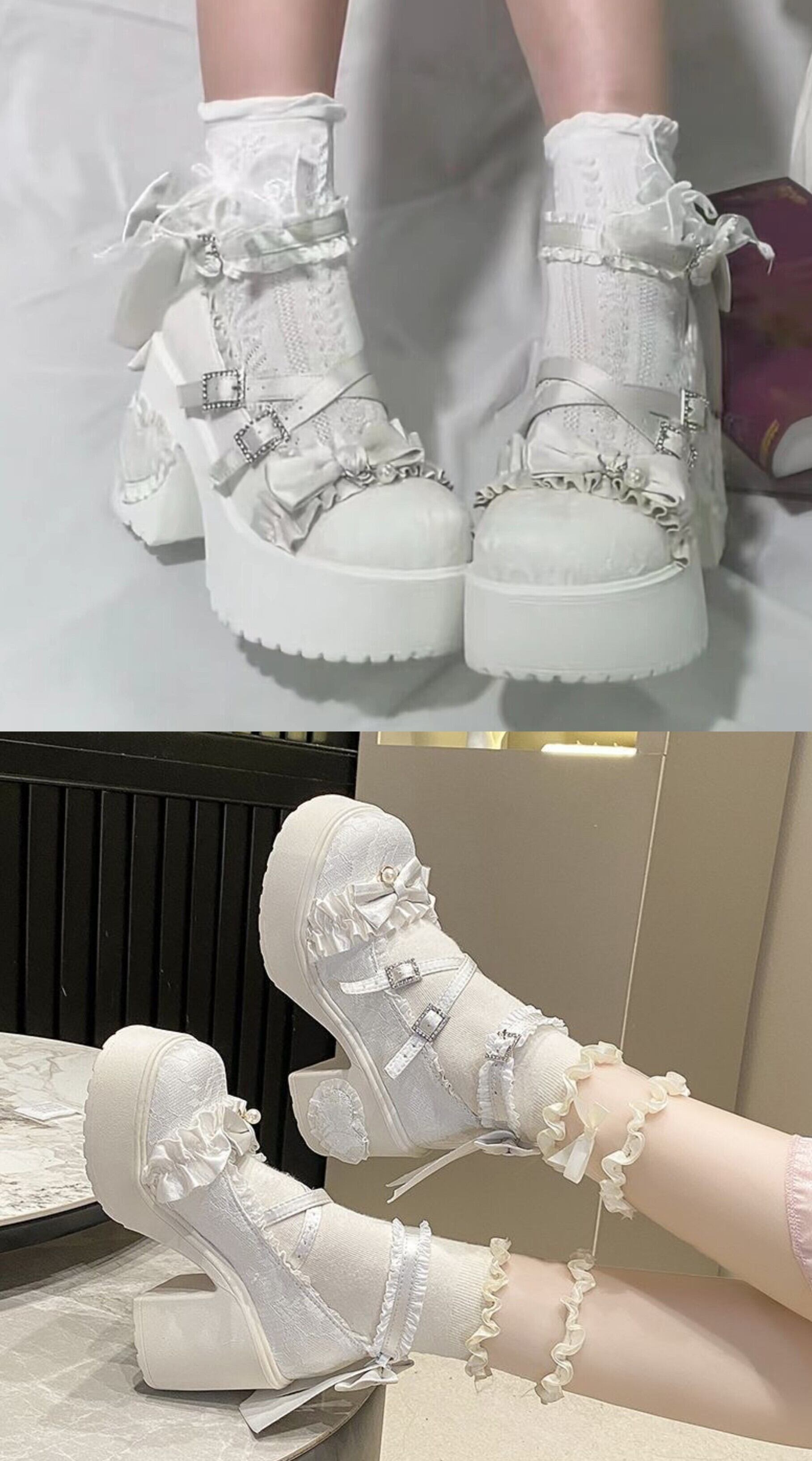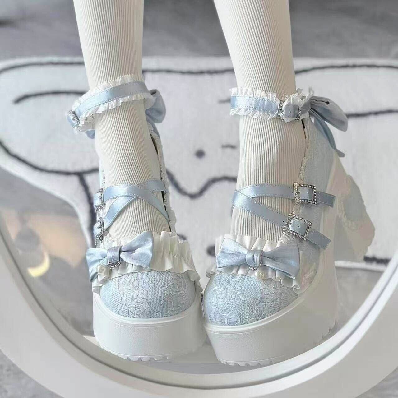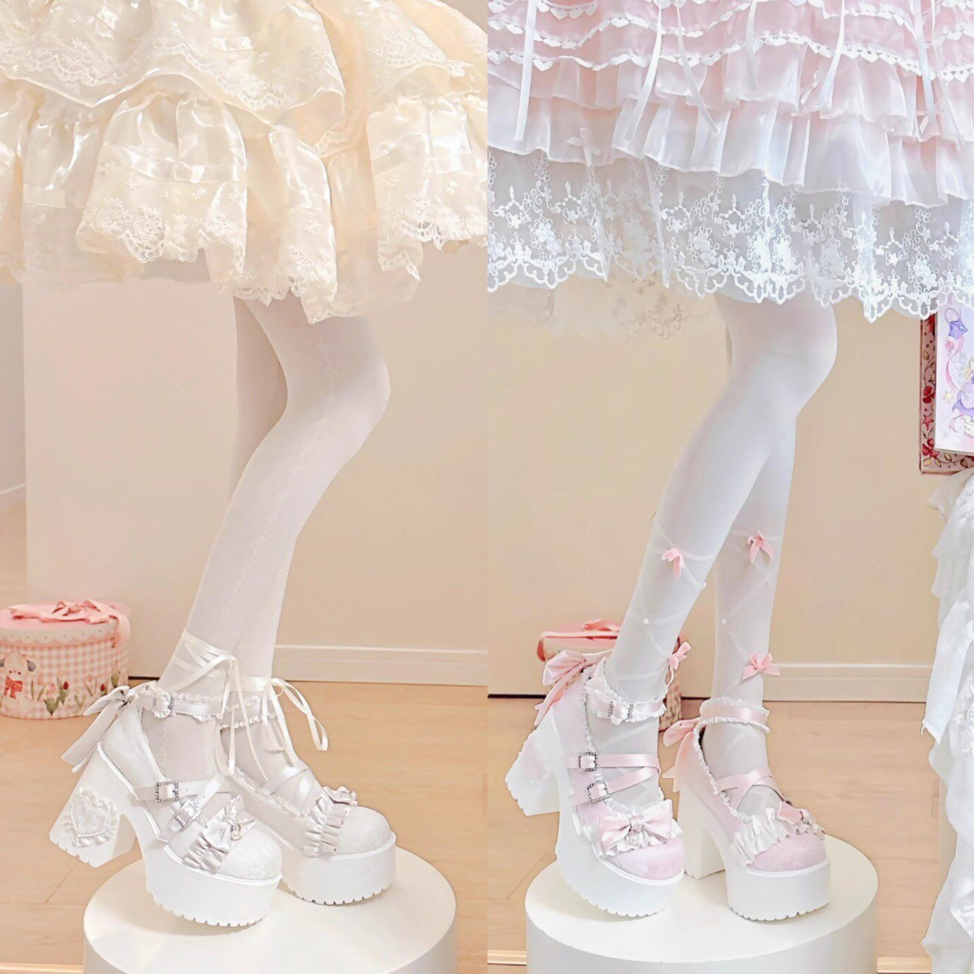 ロリータ 総レース ストラップ パンプス ハイヒール リボン 4color
