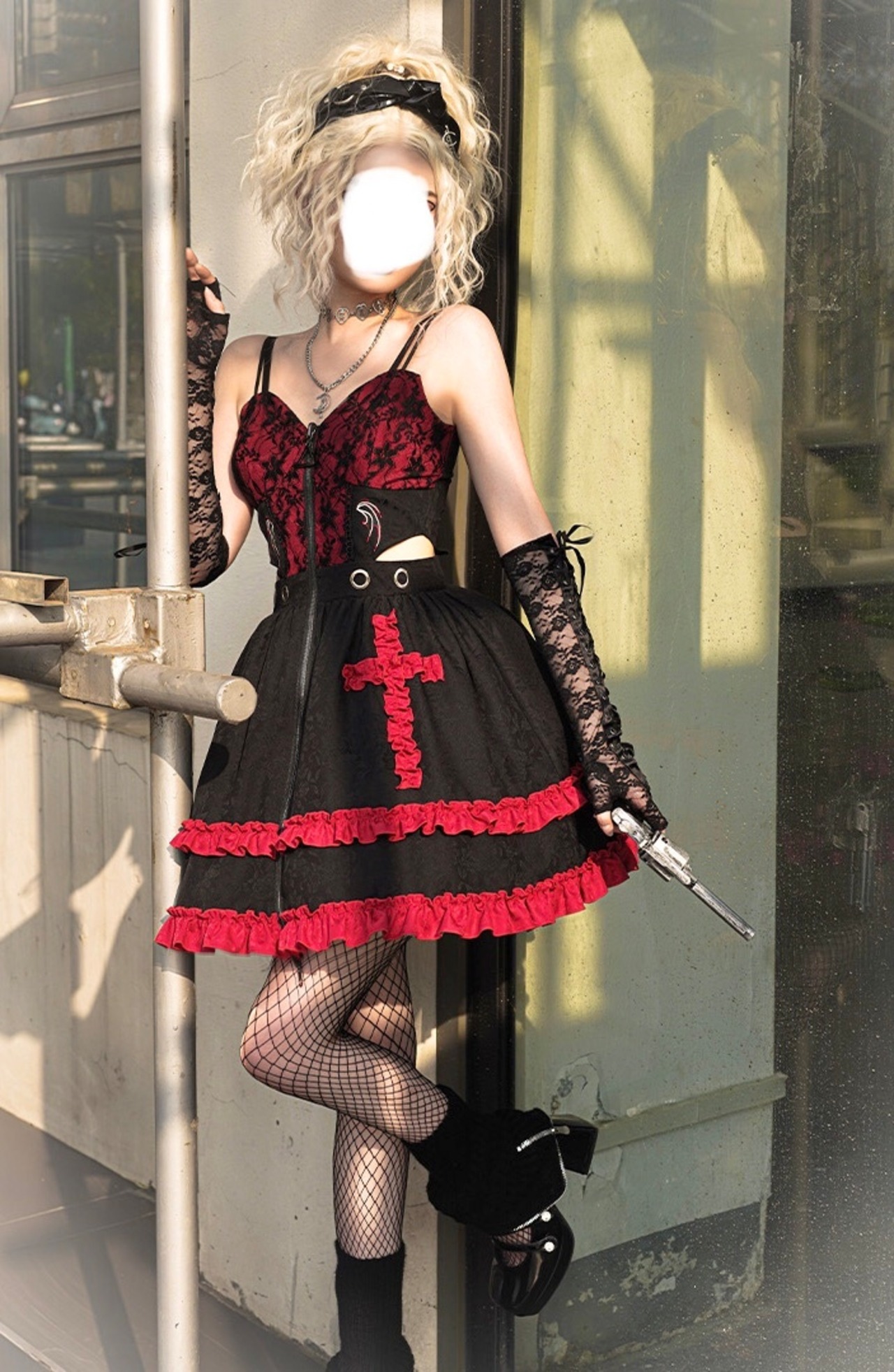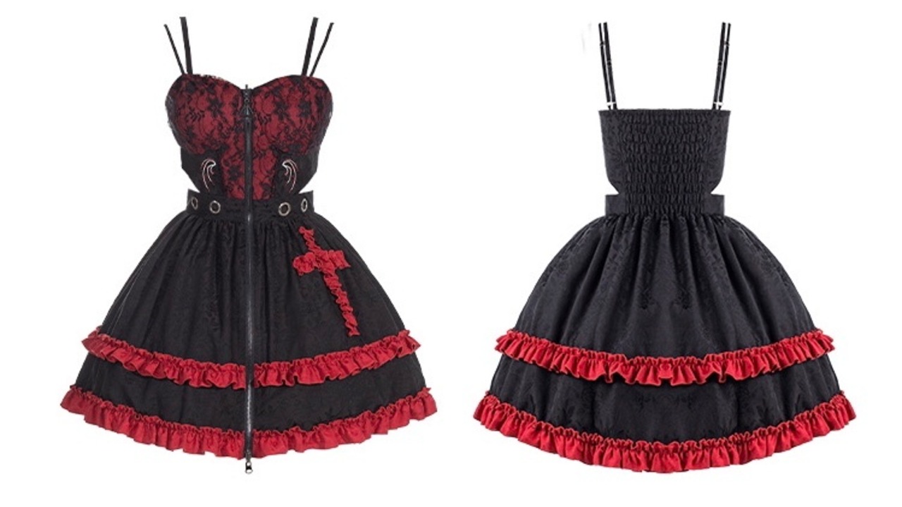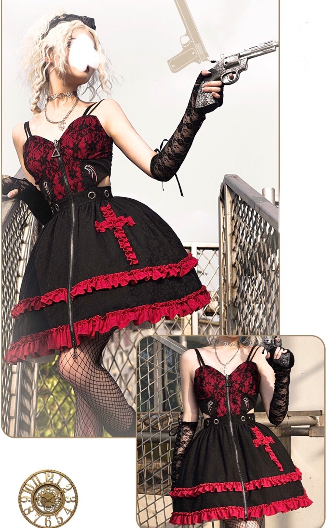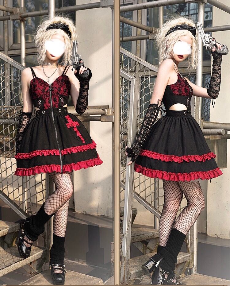 ゴスロリ キャミワンピース レース ブラック×レッド ミニワンピース